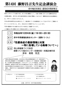 お知らせ 2019年9月5日更新 第14回藤野昌言先生記念講演会 令和元年10月4日(金)19:00~20:30 明治12年コレラ大流行の折、自らの命を犠牲にして、当地で診療に当たられた藤野昌言先生の偉業を讃え、府中市と府中地区医師会の共催で開催している講演会です。今年は岸本寿男先生をお招きして、最近増えている性感染症についてご講演いただきます。尺八の奏者でもいらっしゃる岸本先生が、心癒される尺八の音色もご披露くださいます。ぜひ多数の方のご参加をお待ちしております。 2025年07月29日更新 第17回藤野昌言先生記念講演会 令和7年10月6日(月)19:00~20:30 2025年07月29日更新 救急の日 府中地区救急法等講習会 令和7年9月4日(木)13:30~16:00 2025年04月24日更新 市民のための救急医療講演会 令和7年6月6日(金)19:00~20:40 2024年07月31日更新 第16回藤野昌言先生記念講演会 令和6年10月11日(金)19:00~20:30 2024年07月10日更新 救急の日 府中地区救急法等講習会 令和6年9月4日(水)13:30~16:00 府中地区介護支援専門員連絡協議会のご案内 府中地区医師会准看護学院 かかりつけ医について 医師会関連 日本医師会 広島県医師会 福山市医師会 松永・沼隈地区医師会 深安地区医師会